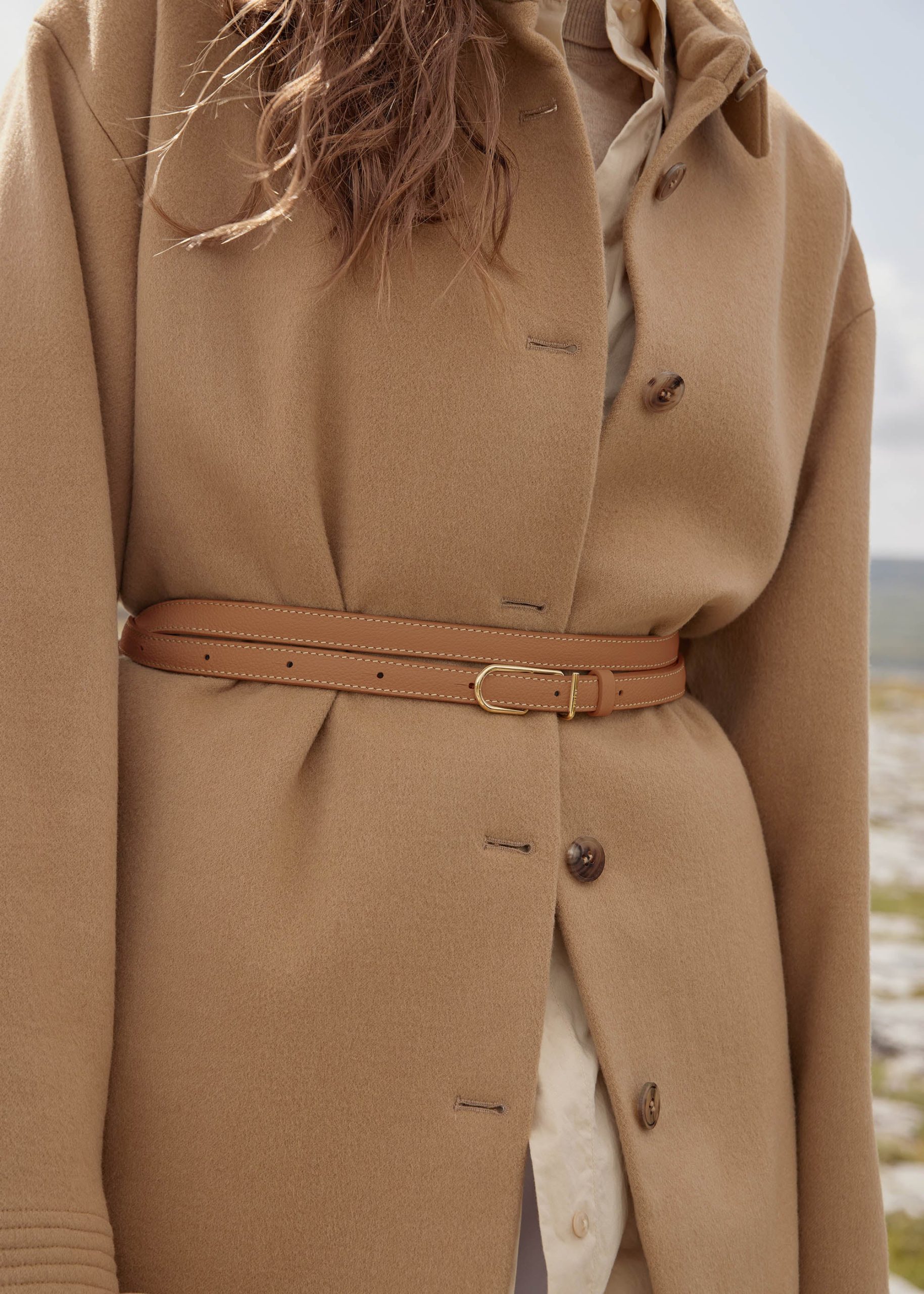 Avec son double-tour en cuir noué autour d’une boucle sobre et élégante, la ceinture fine « Umi » souligne la taille et structure la silhouette.