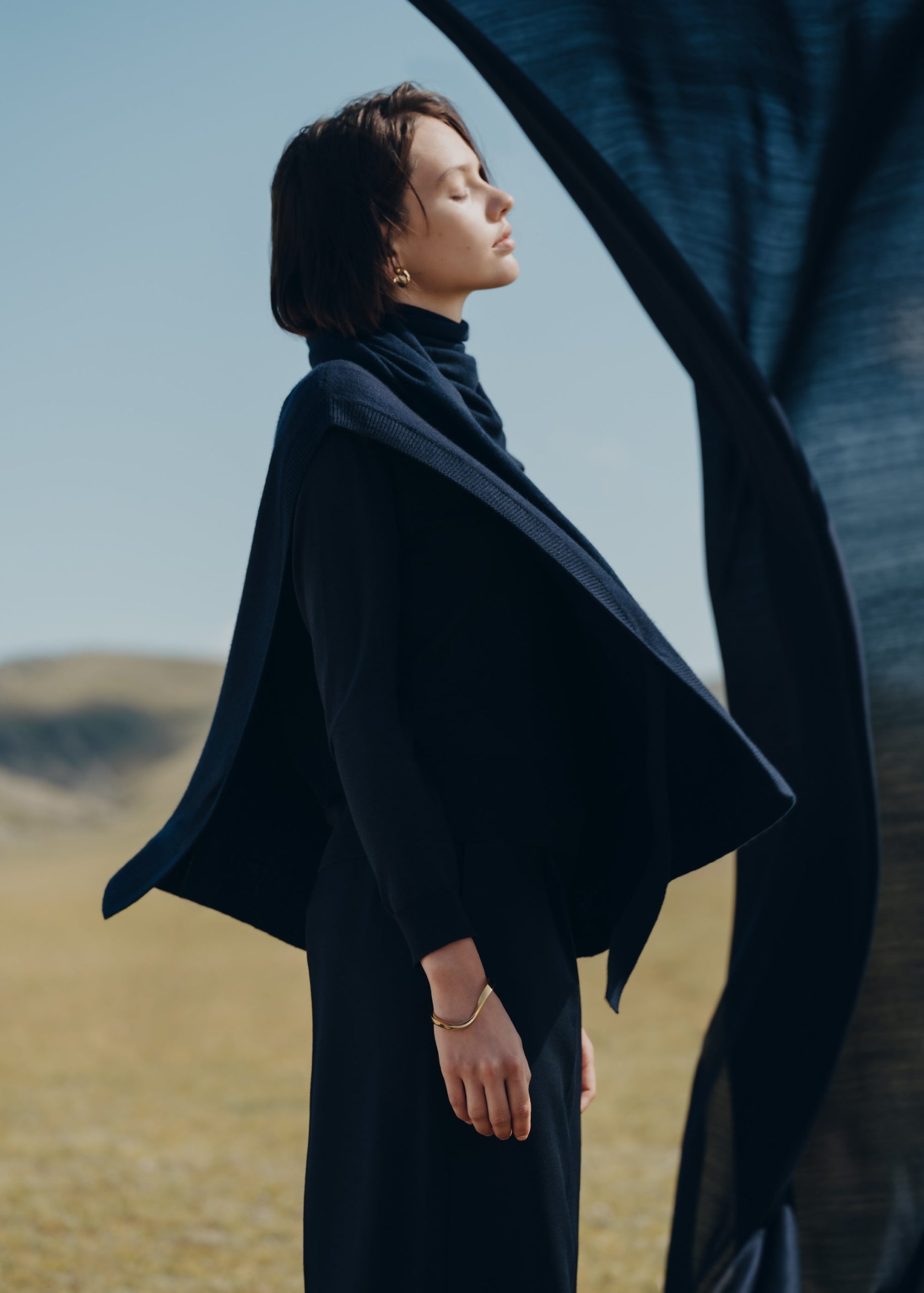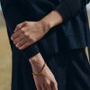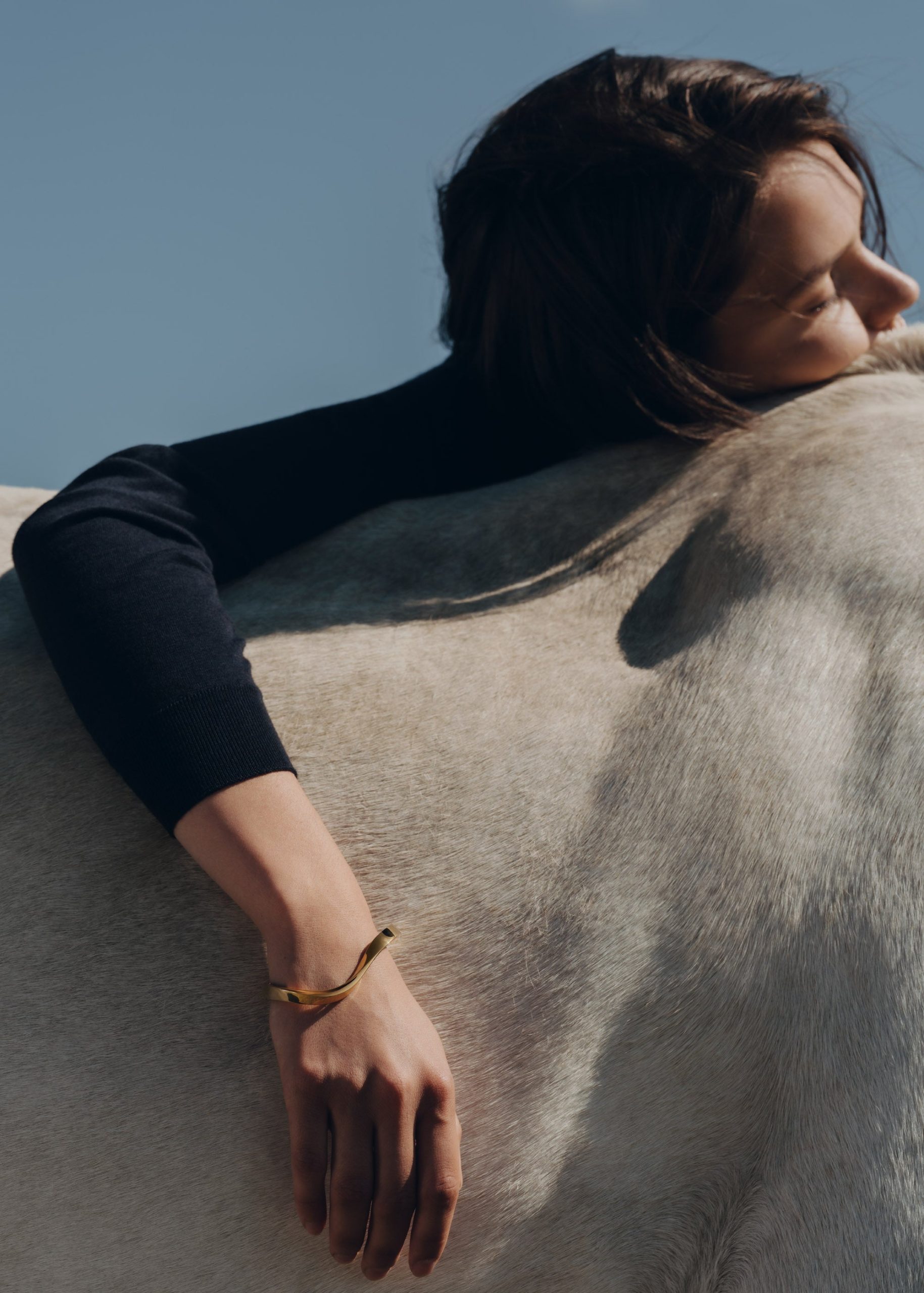 Le jonc Éole tournoie autour du poignet en une danse élégante. Son ruban se dédouble, créant une ondulation supplémentaire laissant entrevoir la peau.