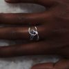 Une forme sensuelle qui voit s’imbriquer deux anneaux organiques réunis en une bague à l’ondulation comme infinie. La finition miroir est minutieusement polie à la main.