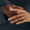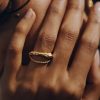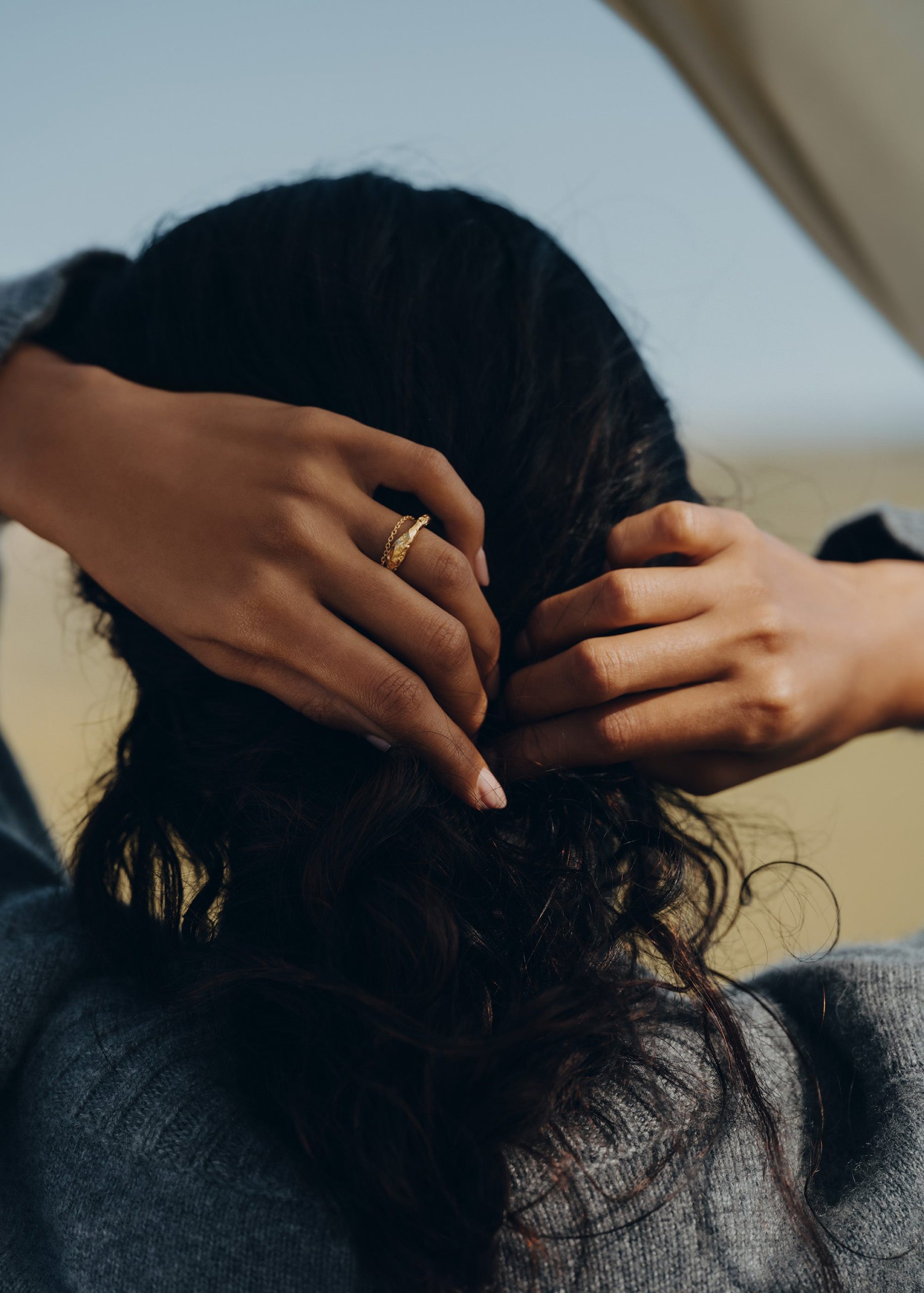 La bague chaîne Eroz réunit aspérités rocheuses et aspect lisse sur son anneau doublé d’une fine chaîne aux maillons délicats qui s’échappe sur le doigt.