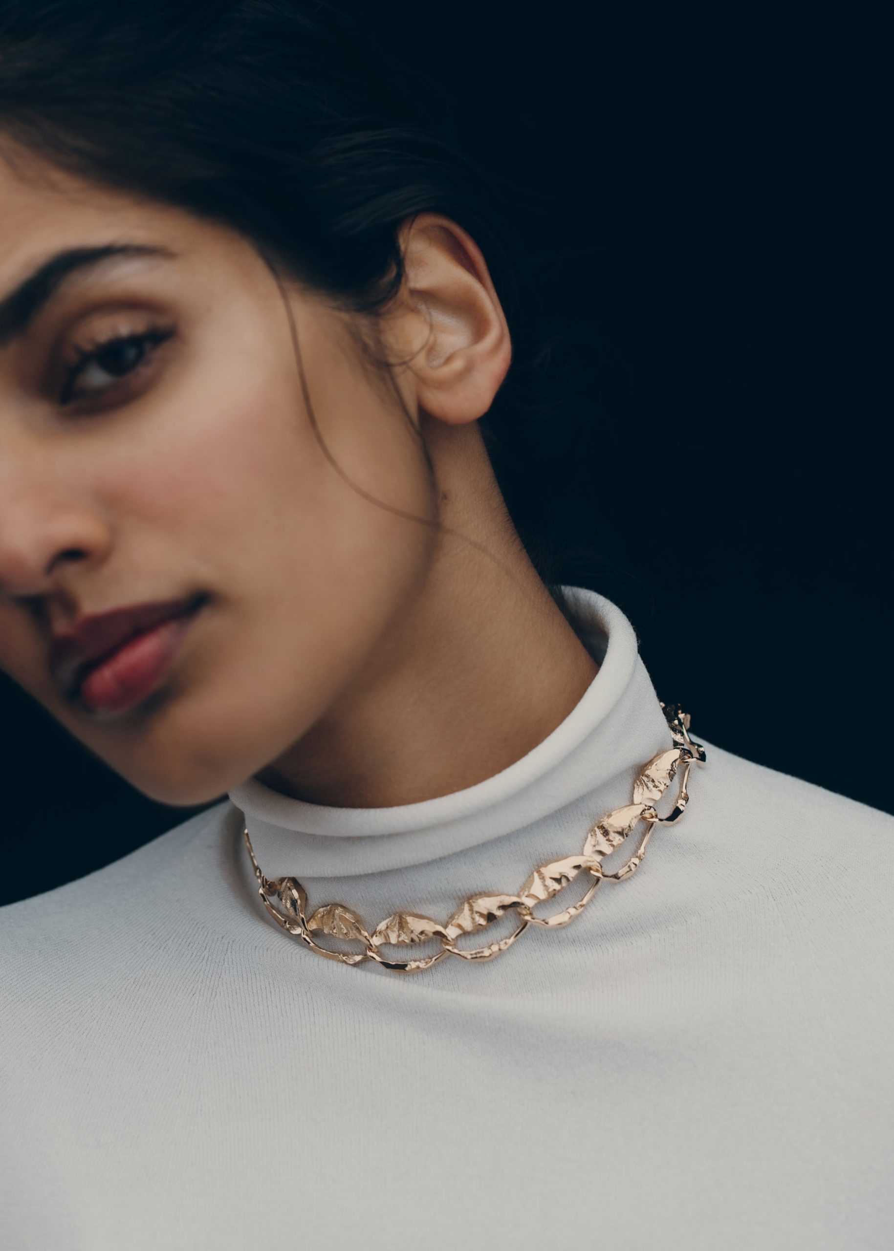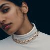 La chaîne Eroz se distingue par ses maillons à la texture taillée comme de la roche en fusion. Entremêlés, les anneaux laissent apparaître la peau, comme une matière précieuse intégrée au bijou.