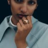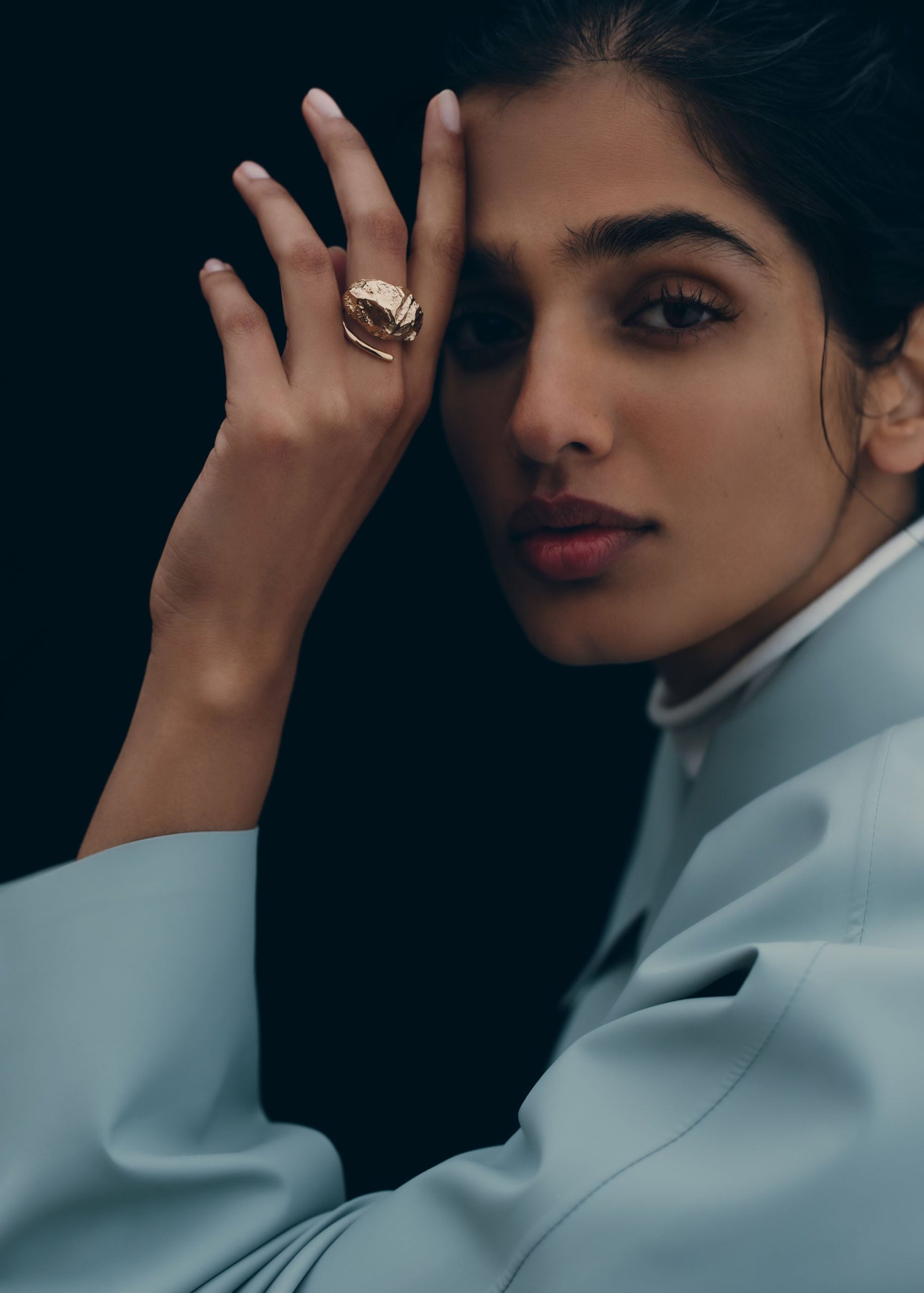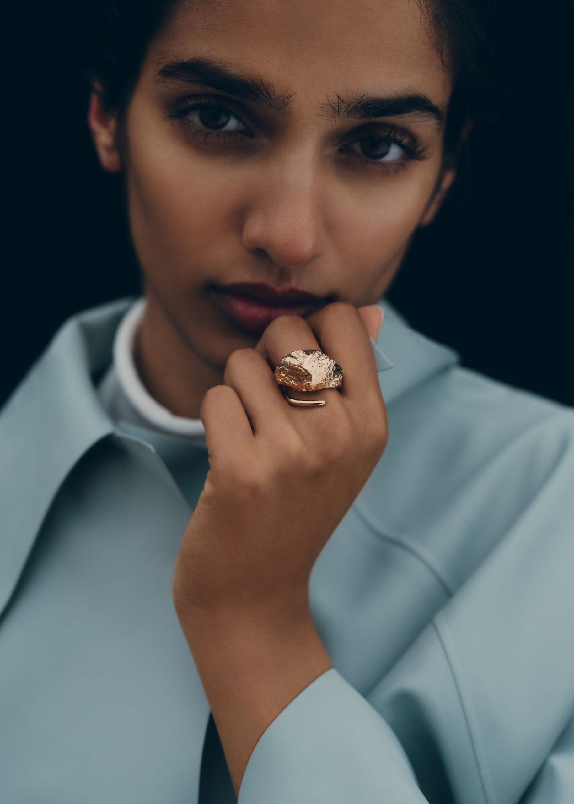 La bague Eroz joue sur l’équilibre entre la texture rocheuse taillée en volume et la finesse de l’anneau lisse qui enlace le doigt.