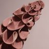 Issue de la collection Plèi 100% en chutes de cuir upcyclées, la fleur « Orki » est une plante onirique. Sa forme conique sur huit étages et son inclinaison arquée rappellent la glycine. Dans un duo de cuirs, ses pétales circulaires de taille dégressive sont pliés et assemblés par des coutures et des points à la main évoquant le raffinement de l’orchidée. Le long de la tige gainée de cuir, une feuille effilée est cousue.
