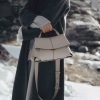 Le modèle « Mokki » valorise l’art du pliage avec son cuir grainé. Une découpe aux angles révèle le cuir lisse pour un subtil jeu de textures. Sous son rabat souligné d’un fermoir gravé, l’intérieur compartimenté est spacieux. Grâce à sa bandoulière adaptable maintenue par des mousquetons, le modèle suit avec fluidité le mouvement.