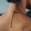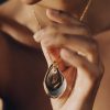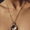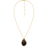 Un pendentif retenu par une fine chaîne superpose une goutte sculptée dans le verre et une plaque en laiton dorée, dévoilant par transparence le logo Polène gravé dessus.