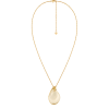 Un pendentif retenu par une fine chaîne superpose une goutte sculptée dans le verre et une plaque en laiton dorée, dévoilant par transparence le logo Polène gravé dessus.