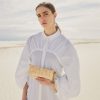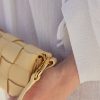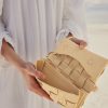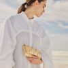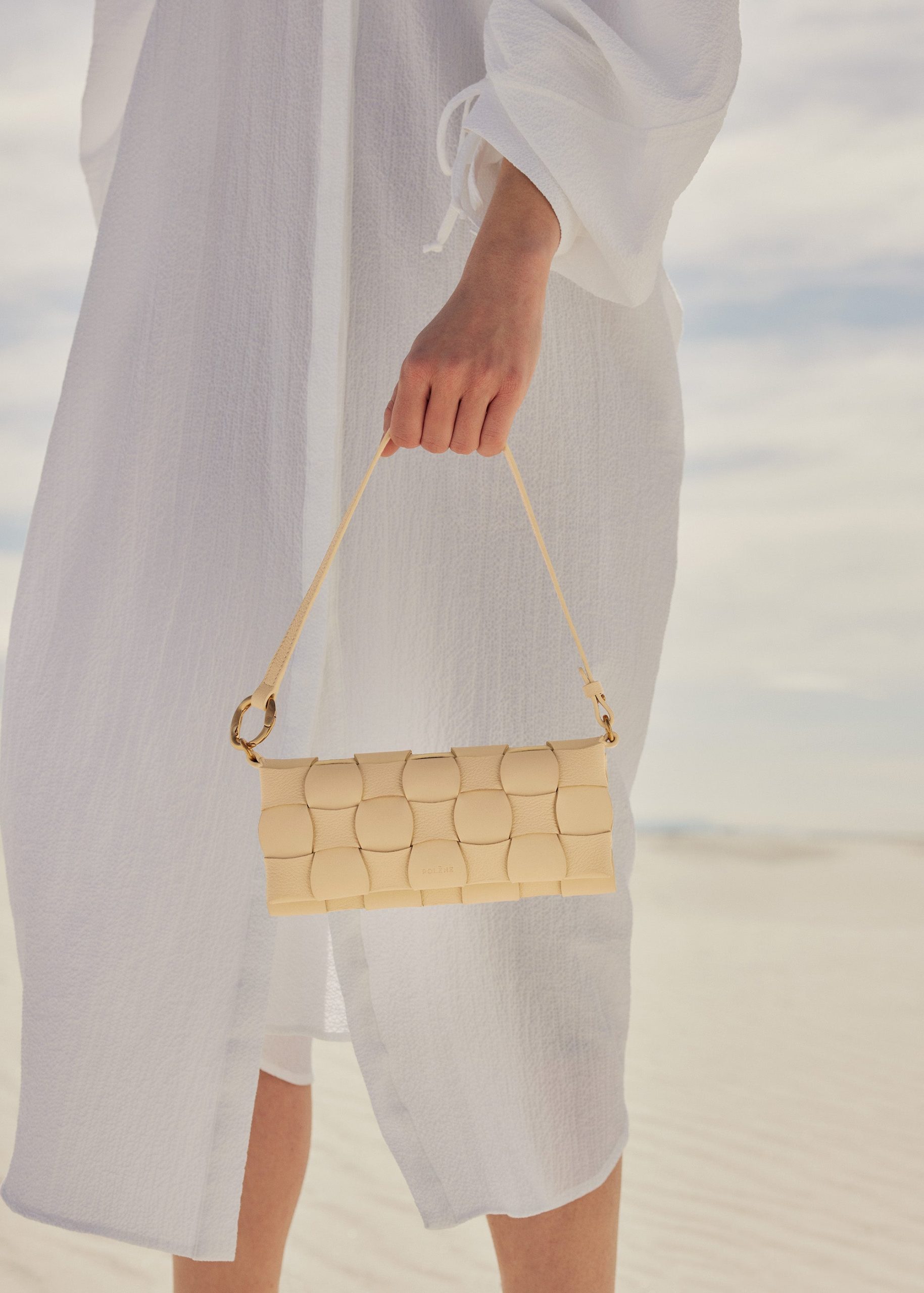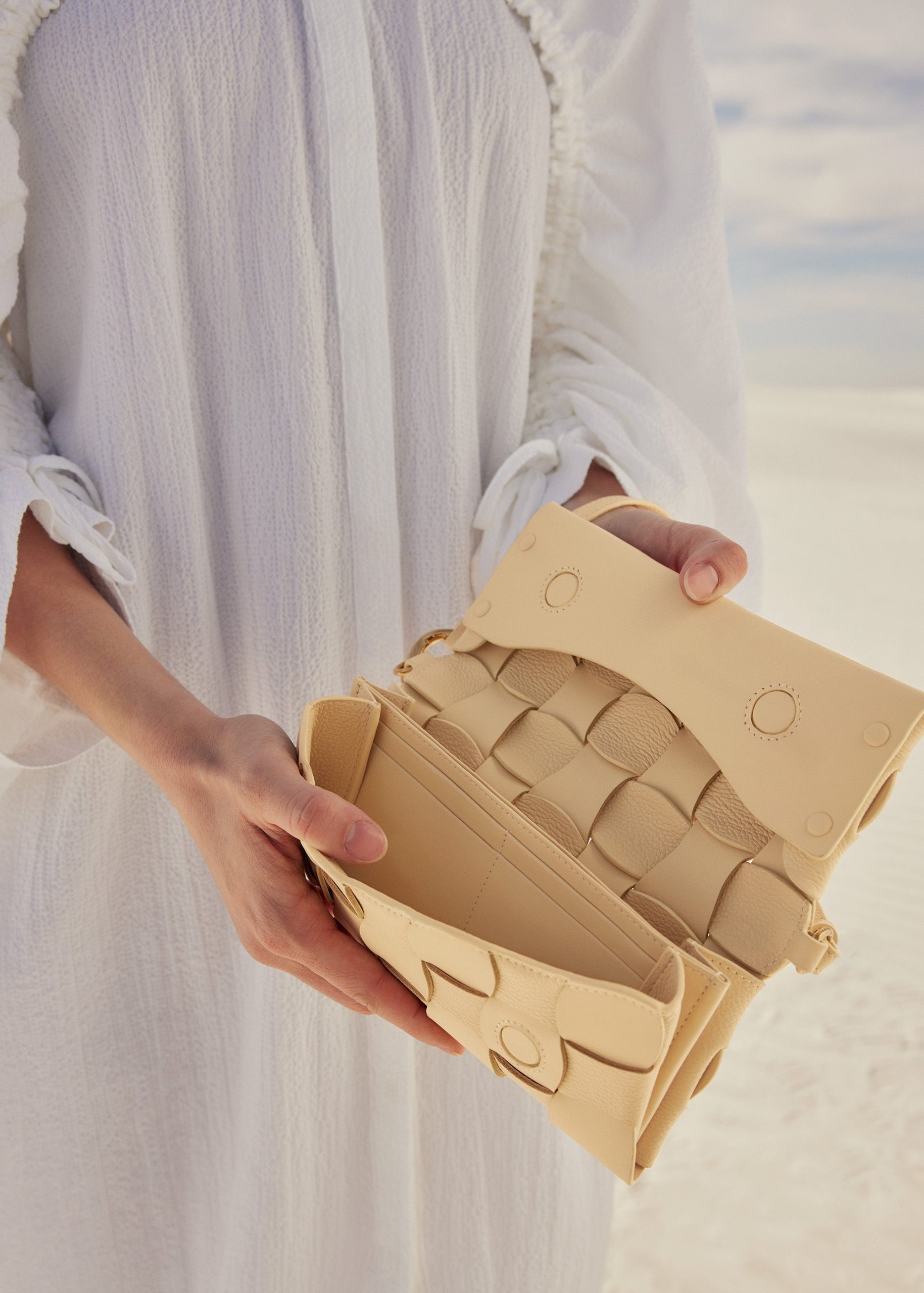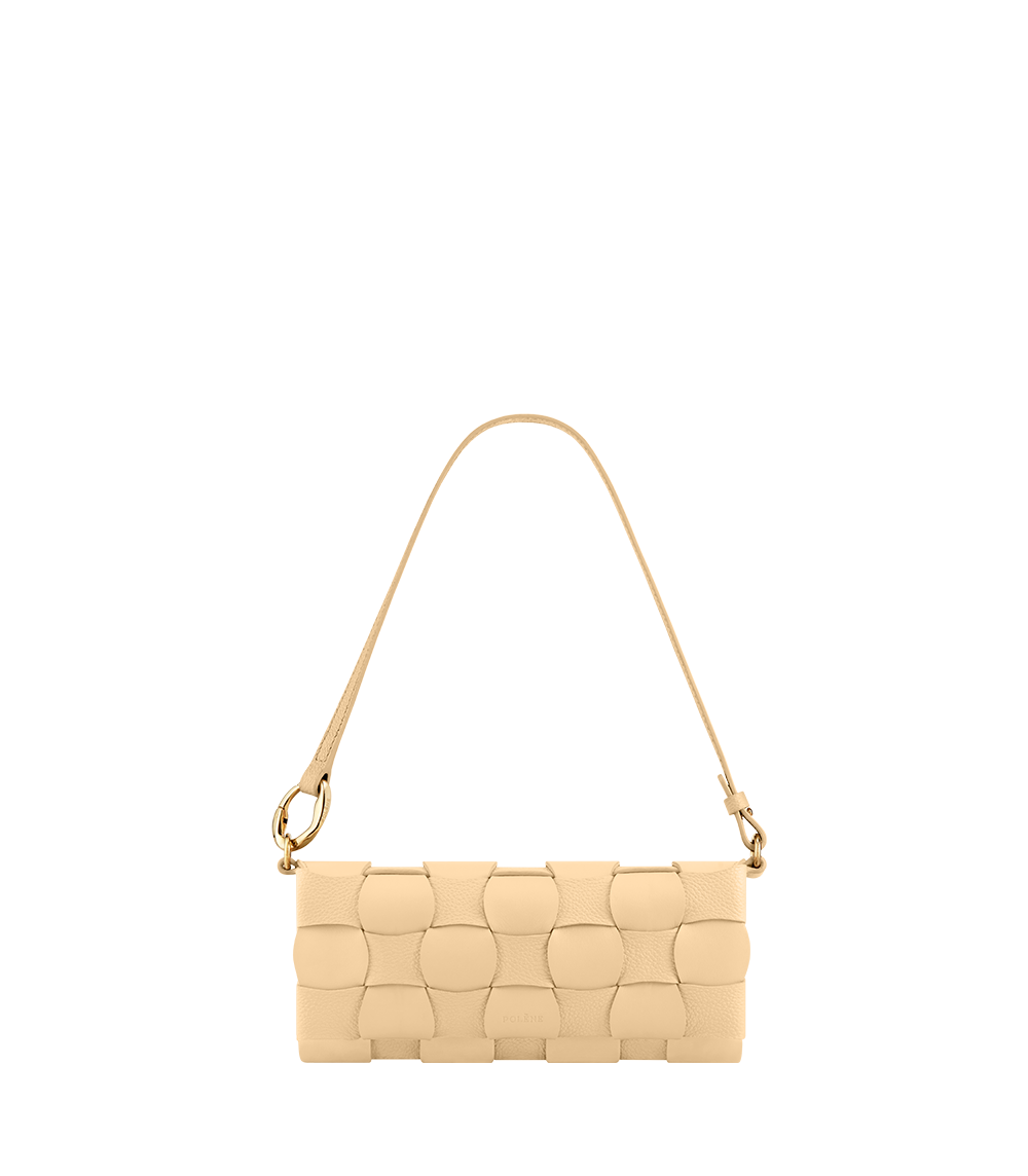 Le modèle Neiti réinterprète une technique iconique de la maroquinerie, le tressage, en l’adoucissant aux travers de lignes ondulées comme des vagues et en entrecroisant des cuirs ton-sur-ton lisse et grainé. Un savant jeu de pliage donne à ce mini-sac sa forme et son volume.