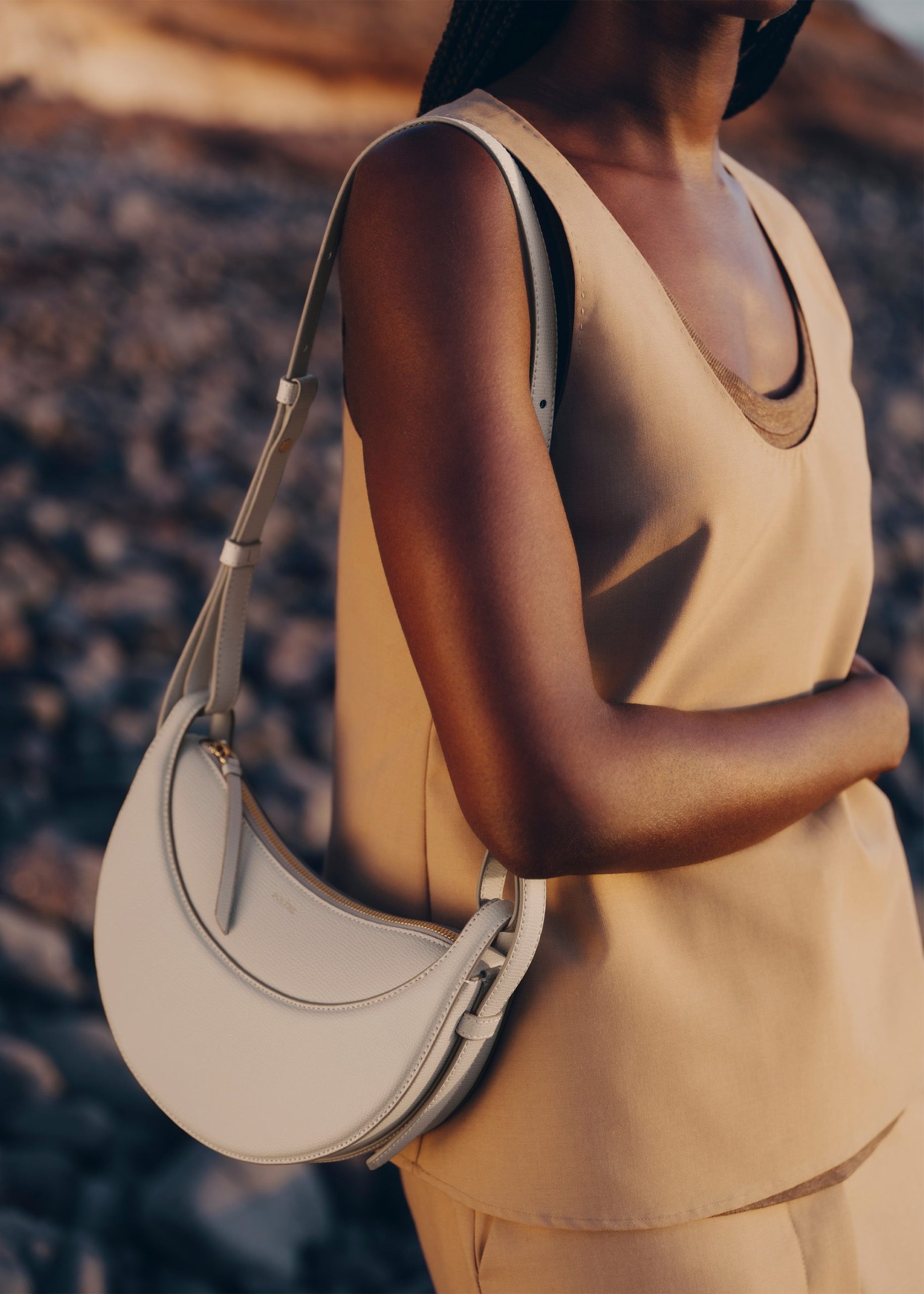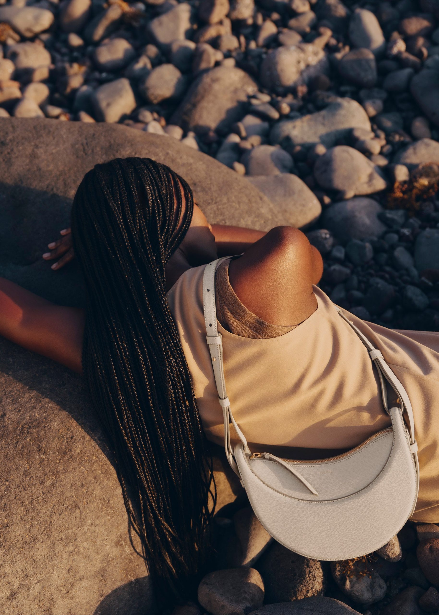 Avec sa forme bombée, son garnissage avec mousse et ses points cousus à la main, le « Numéro Dix » s’inspire des codes équestres de la sellerie. Son design demi-lune joue sur la juxtaposition de courbes.