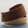 La manchette Ormé se compose de deux éléments incurvés, l’un en métal et l’autre en cuir. Les points de couture réalisés à la main et le rivet assemblant les deux pièces rappellent l’artisanat maroquinier.